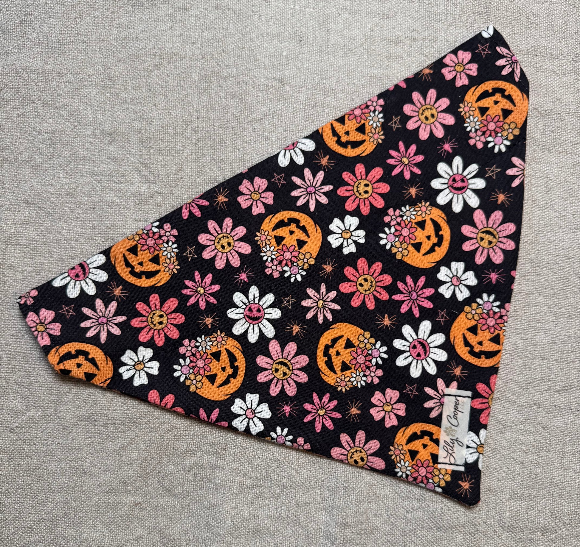Dark background with orange jack-o-lanterns and pink flowers on one side and a light coral/pink background on the other side with pumpkins, mums and spiderwebs. The perfect combination of sweet and spooky!🎃🌸