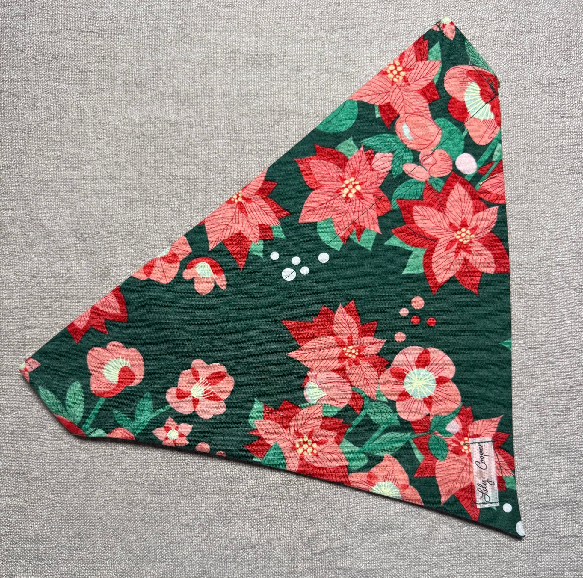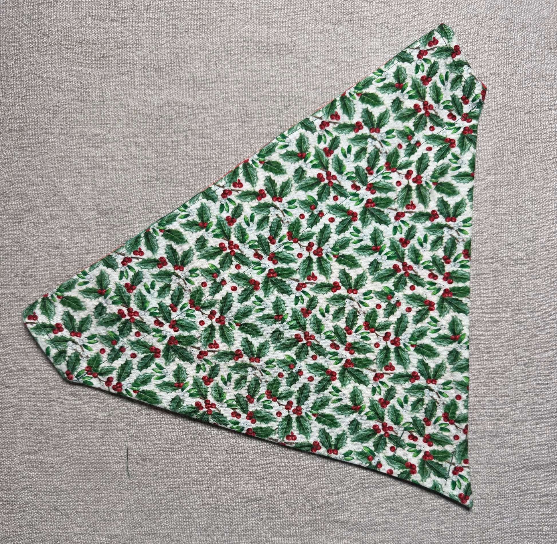 One side is dark green with beautiful red and pink large poinsettias while the other side his green and red clusters of holly.