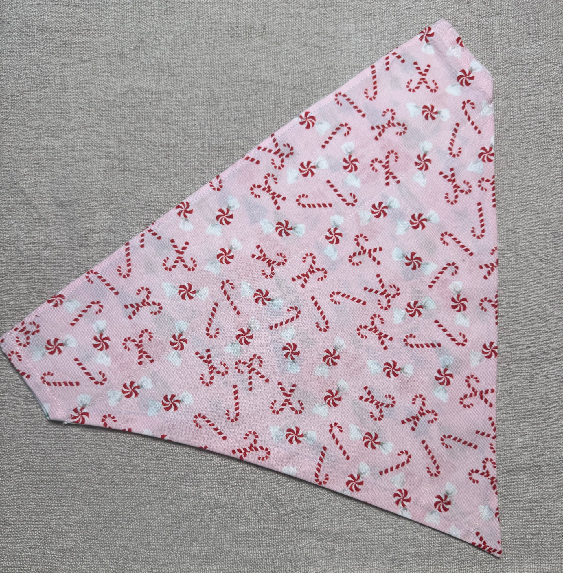 One side has small red, pink, green, and blue watercolor pine trees on a white background and the other side has red and white striped peppermint candy and candy canes on a light pink background.